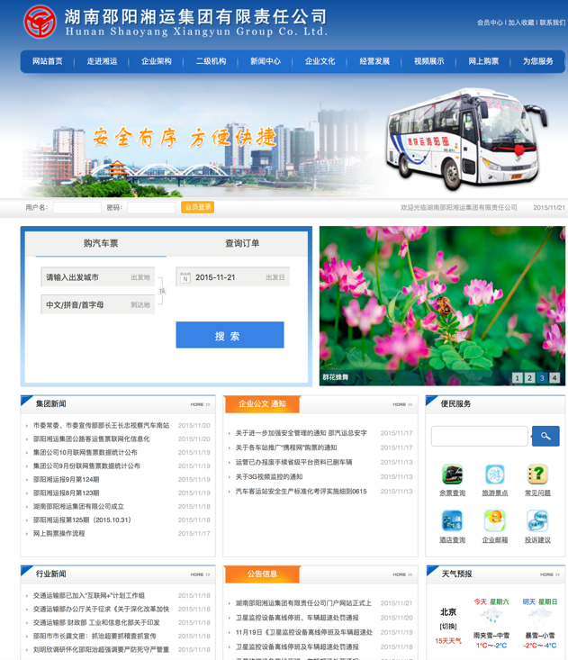 為加強企業(yè)信息化工作,利用網(wǎng)站推廣企業(yè)文化、提升內(nèi)部管理效率,湖南邵陽湘運集團有限責(zé)任公司官方網(wǎng)站域名m.mydfxx.com于11月11日通過審核,網(wǎng)站次日正式上線發(fā)布。集團公司與旗下客運子公司均有獨立版面,可發(fā)布文件信息、動態(tài)新聞等,今后集團公司的公文、通知等將在網(wǎng)上發(fā)布,各子公司在網(wǎng)上查看下載,極大提升了文件發(fā)布的效率。該網(wǎng)站最大的特點是可以查詢邵陽地區(qū)一二級車站所有車輛班次、時間、價格信息,并可在線購票,購票成功后憑密碼或身份證前往車站自動取票機(或人工售票窗口)取票,該網(wǎng)站為旅客提供了一個便捷的購票渠道。